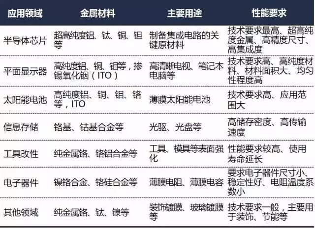 濺射技術(shù)作為薄膜材料制備的主流工藝,其應(yīng)用領(lǐng)域廣泛,如集成電路、平板顯示器、太陽能電池、信息存儲(chǔ)、工具改性、光學(xué)鍍膜、電子器件、高檔裝飾用品等行業(yè)。高純?yōu)R射靶材則主要用于對(duì)材料純度、穩(wěn)定性要求更高的領(lǐng)域,如集成電路、平板顯示器、太陽能電池、記錄媒體、智能玻璃等行業(yè)。